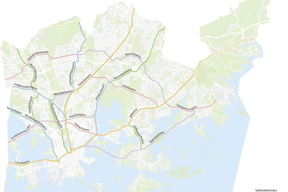In the city centre, you can cycle on the original Baana leading to the Kaisantunneli Tunnel and on the Keskuspuistonbaana in Central Park next to the Olympic Stadium. The Pasilanbaana, now largely complete, is improving the transverse connections in the inner city. In the suburbs, you can cycle past Käpylä and Oulunkylä along Pohjoisbaana and then from Oulunkylä towards Itäkeskus along Viikinbaana. In the next few years, the Itäbaana from Kulosaari to Herttoniemi will be continued all the way to Itäkeskus.