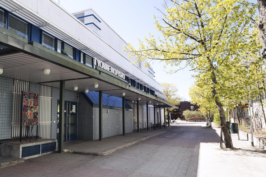 - Sisäänkäynnin ovet erottuvat selkeästi, lasiovissa on kontrastimerkinnät. Oven ulkopuolella on riittävästi vapaata tilaa liikkumiselle pyörätuolin kanssa. Ovi aukeaa automaattisesti liikkeentunnistimella.