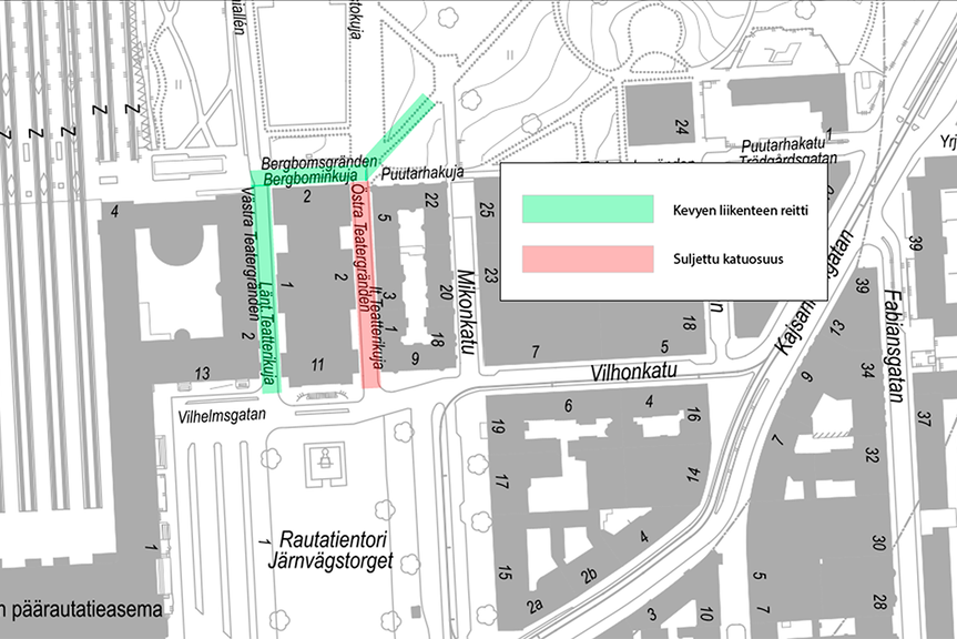 - Pyöräilijät ja jalankulkijat ohjataan Kaisaniemenpuistosta Vilhonkadulle Läntisen Teatterikujan kautta.