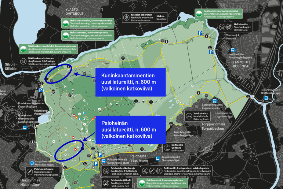 Keskuspuistoon tulee uusi opastusjärjestelmä, jonka yhteydessä tehdään joitakin muutoksia ulkoilureitteihin. Nykyisin talvisin latuina toimivat reitit Kuninkaantammentiellä ja Paloheinän majan länsipuolella muutetaan ympärivuotisiksi kävely- ja pyöräilyreiteiksi. Näiden vierelle rakennetaan uudet, noin 600 metrin mittaiset latuyhteydet.