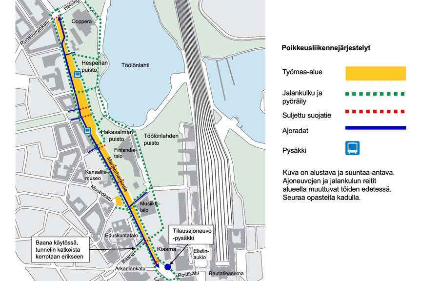 • Kadun itäpuolen jalkakäytävät poistuvat käytössä (välillä Kiasma–Runeberginkatu). Korvaavat reitit Hesperianpuiston ja Töölönlahden kautta tai kadun länsilaitaa.