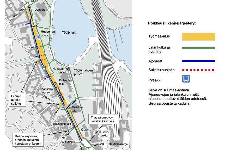 Pyöräliikenne sekä jalankulku siirtyvät Mannerheimintien länsilaidalle sekä kiertoreiteille Hesperianpuiston, Hakasalmenpuiston ja Töölönlahden kautta.