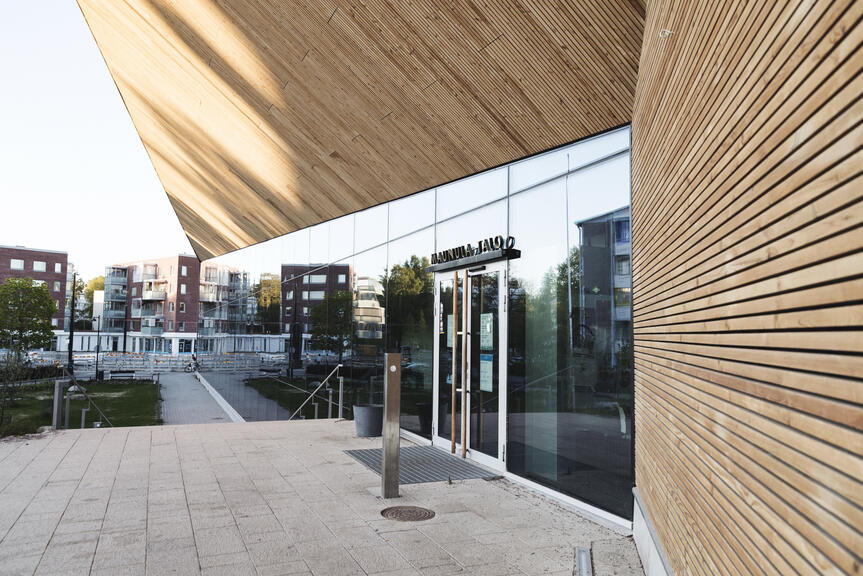 - Dörrarna vid ingången är lätta att urskilja. Utanför dörren finns tillräckligt med fritt utrymme för att röra sig t.ex. med rullstol. Dörren öppnas automatiskt med en öppningsknapp.